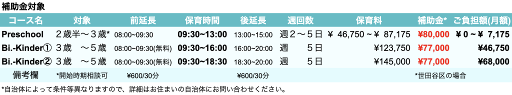 Preschool、Bi.-Kinderを選択して登園されるお子様は無償化の補助金が支給される予定です。